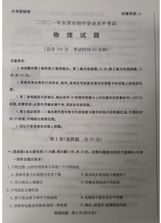 2021年山东东营市初中毕业生学业考试物理试题
