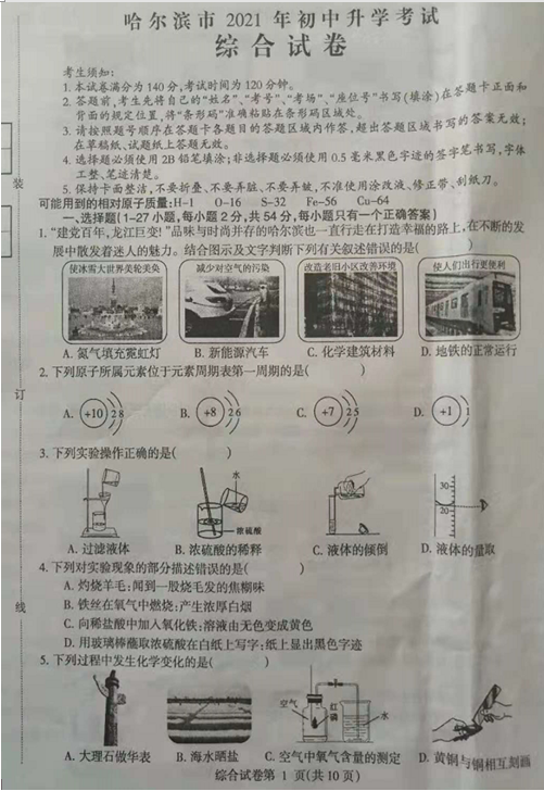 2021年黑龙江哈尔滨市初中毕业生学业考试物理试题