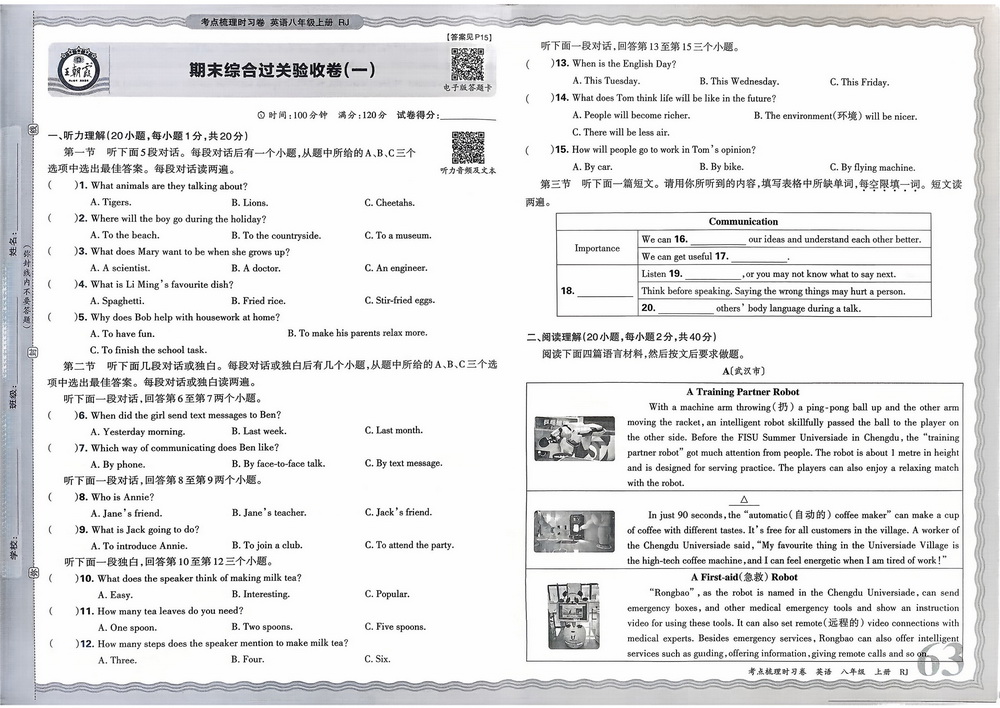 新教材人教版八年级上册英语期末测试卷十五