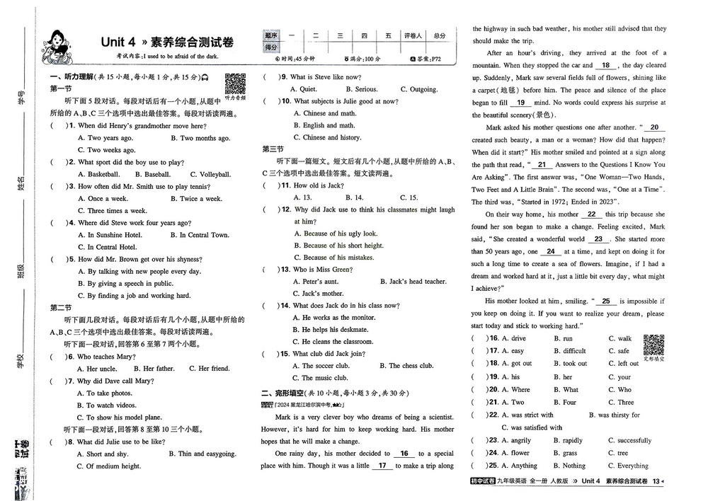 人教版九年级上册英语Unit4测试卷一