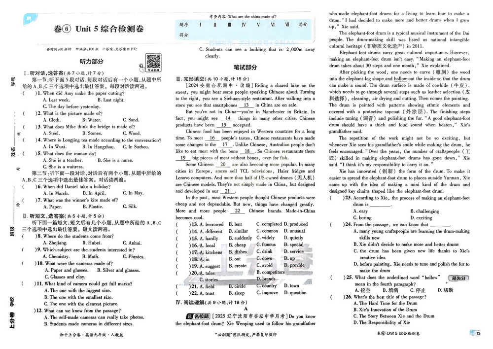 上一篇:人教版九年级上册英语Unit5测试卷一