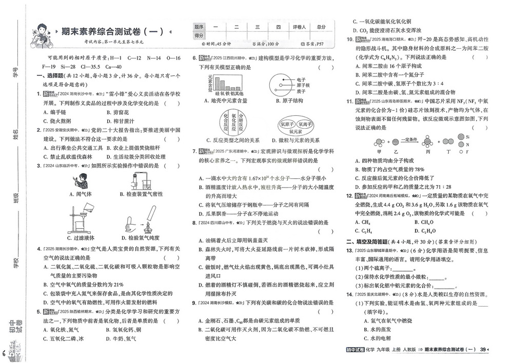 人教版九年级上册化学期末测试卷一