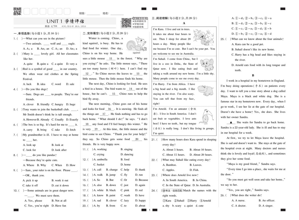 新教材人教版七年级下册英语Unit1综合测试卷一