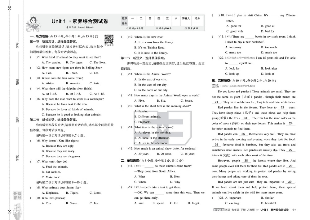 新教材人教版七年级下册英语Unit1综合测试卷四