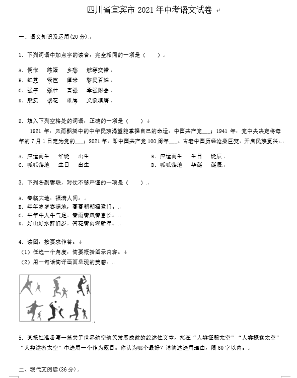 2021年四川省宜宾市初中毕业学业水平考试语文试卷