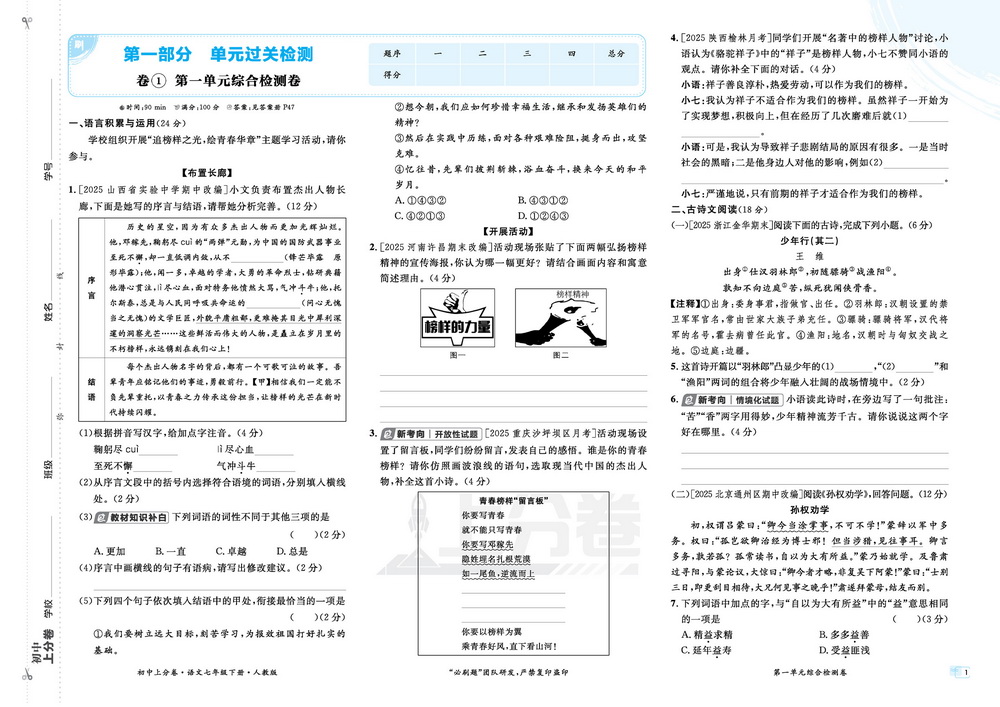 新教材人教版七年级下册语文第一单元测试卷七