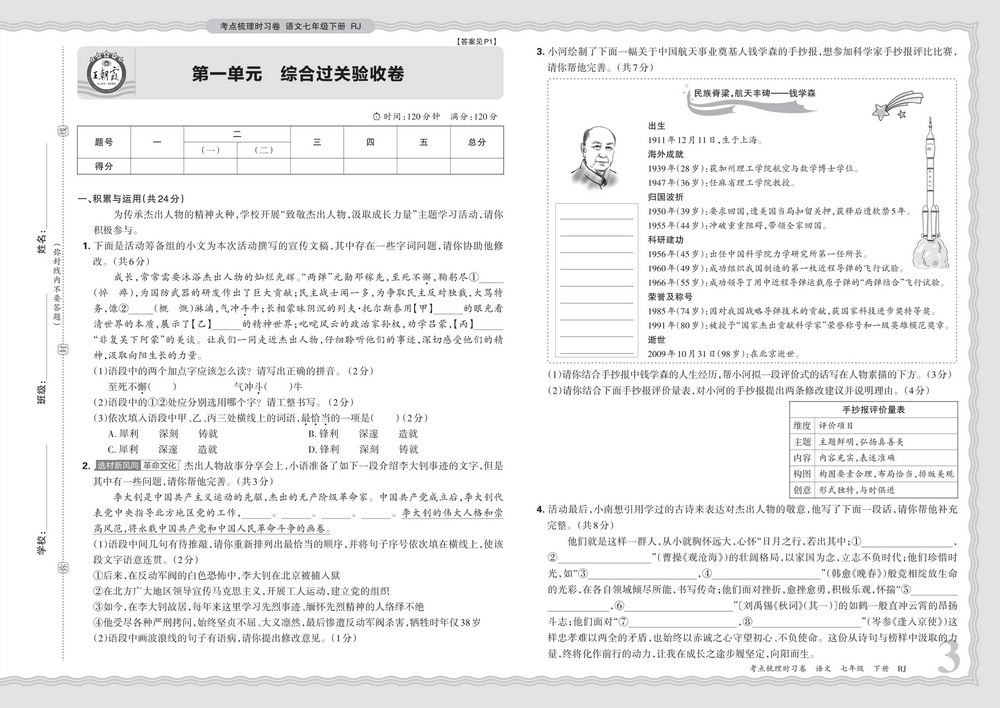 新教材人教版七年级下册语文第一单元测试卷七