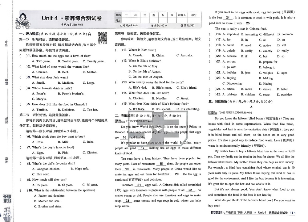 新教材人教版七年级下册英语Unit4测试卷三