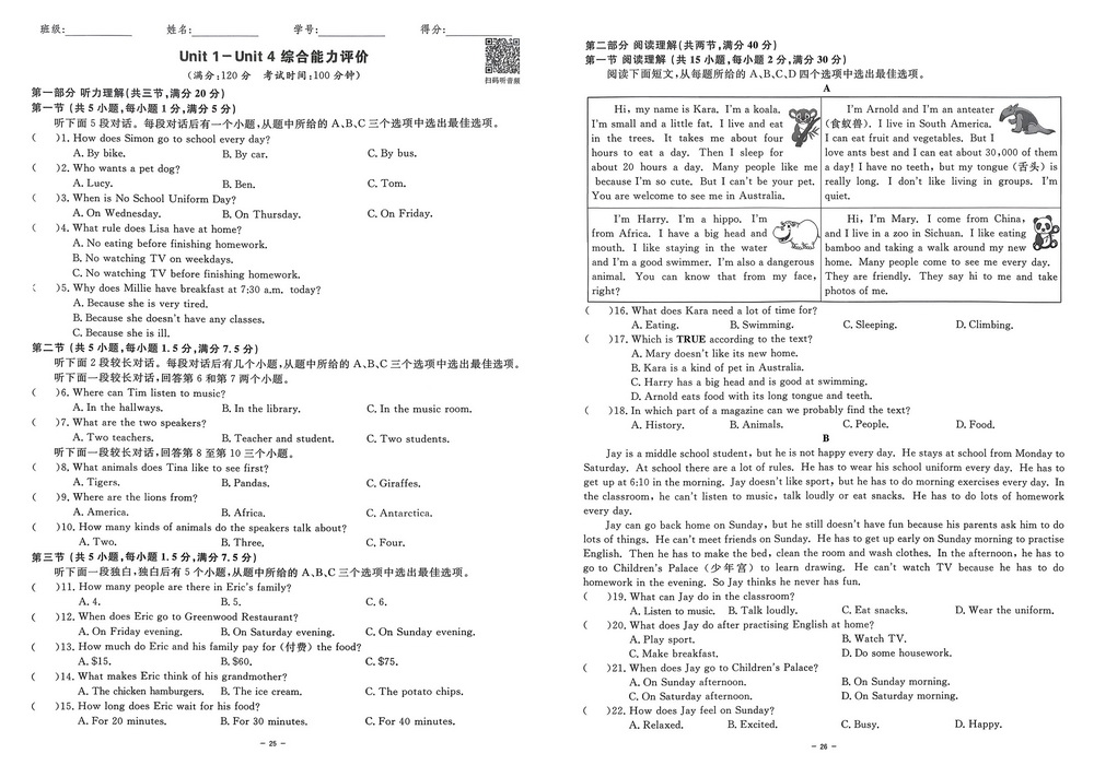 北京交通大学附属中学2024-2025学年七年级下学期期中英语试卷