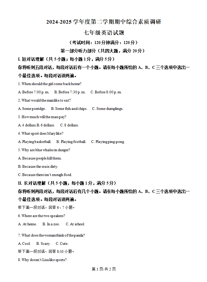 江苏省常州市2024-2025学年七年级下学期期中考试英语试卷