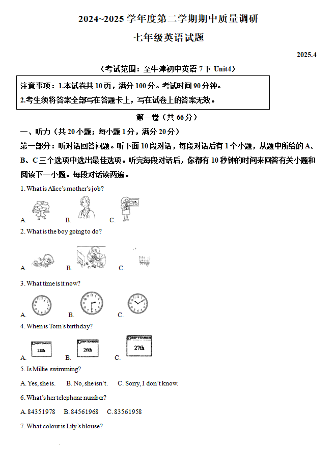 江苏省常州市田家炳初级中学2024-2025学年七年级下学期期中考试英语试卷