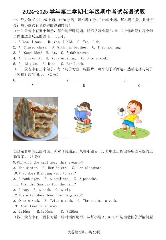 山东省德州市第五中学2024-2025学年下学期期中考试七年级英语试题