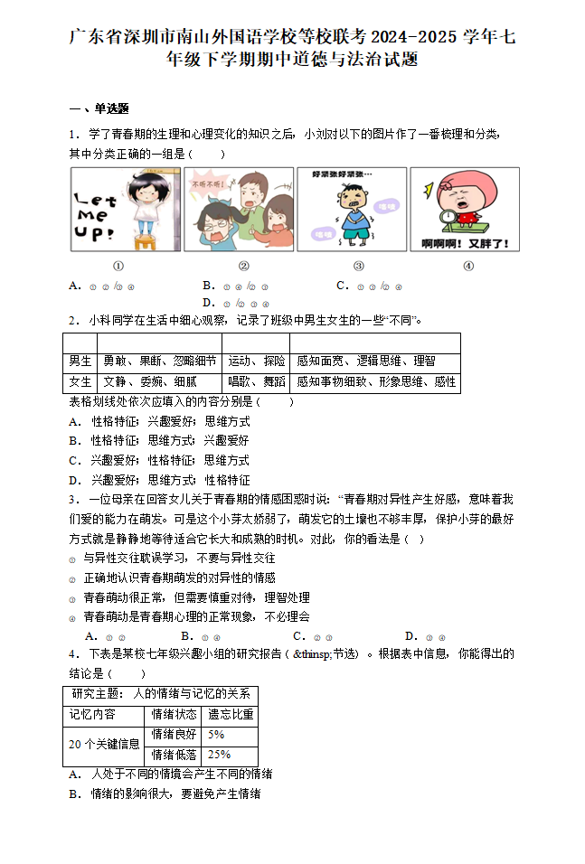 广东省深圳市南山外国语学校等校联考2024-2025学年七年级下学期期中道德与法治试题