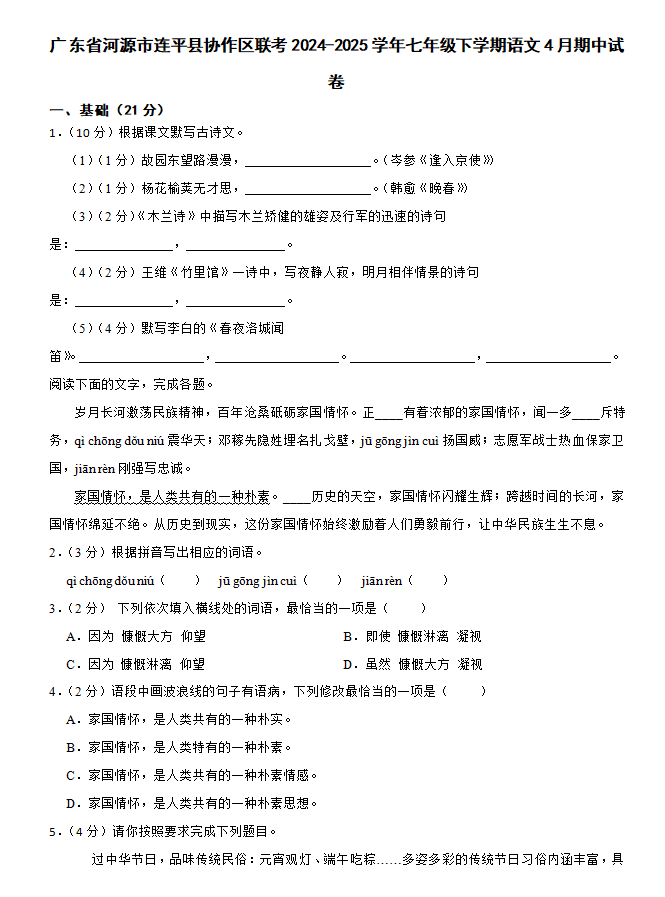 广东省河源市连平县协作区联考2024-2025学年七年级下学期语文期中试卷