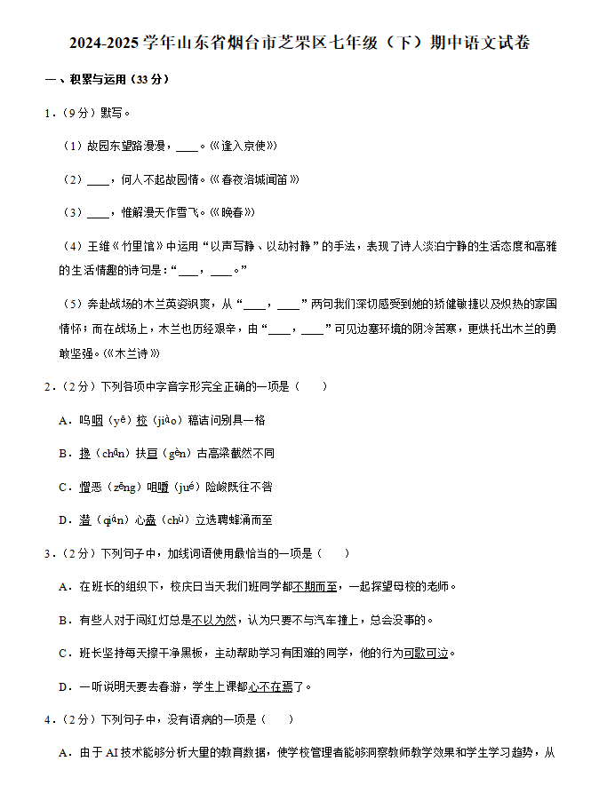 山东省烟台市芝罘区2024-2025学年七年级下学期期中考试语文试题