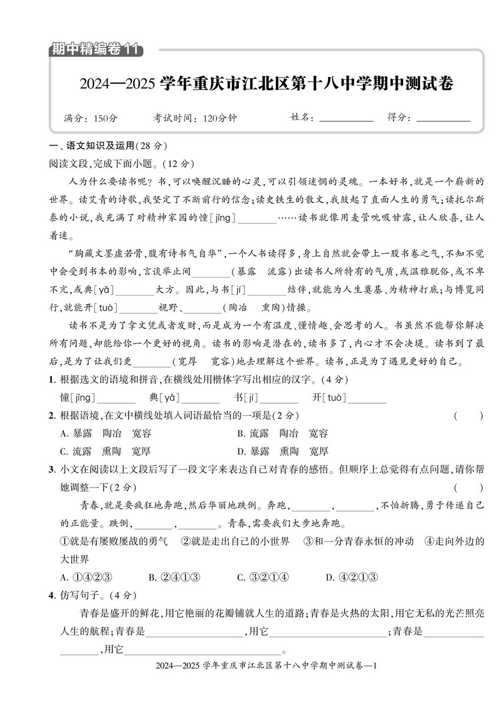 2024—2025学年重庆市江北区第十八中学七年级下学期期中测试卷