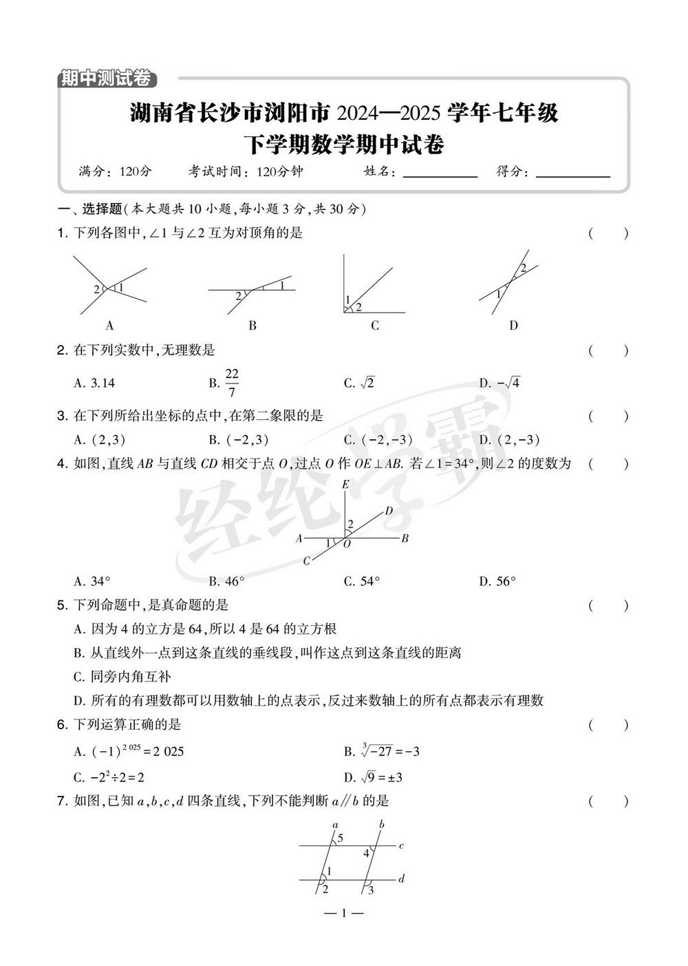 重庆市渝北区实验中学校2024-2025学年七年级下学期数学期中试卷
