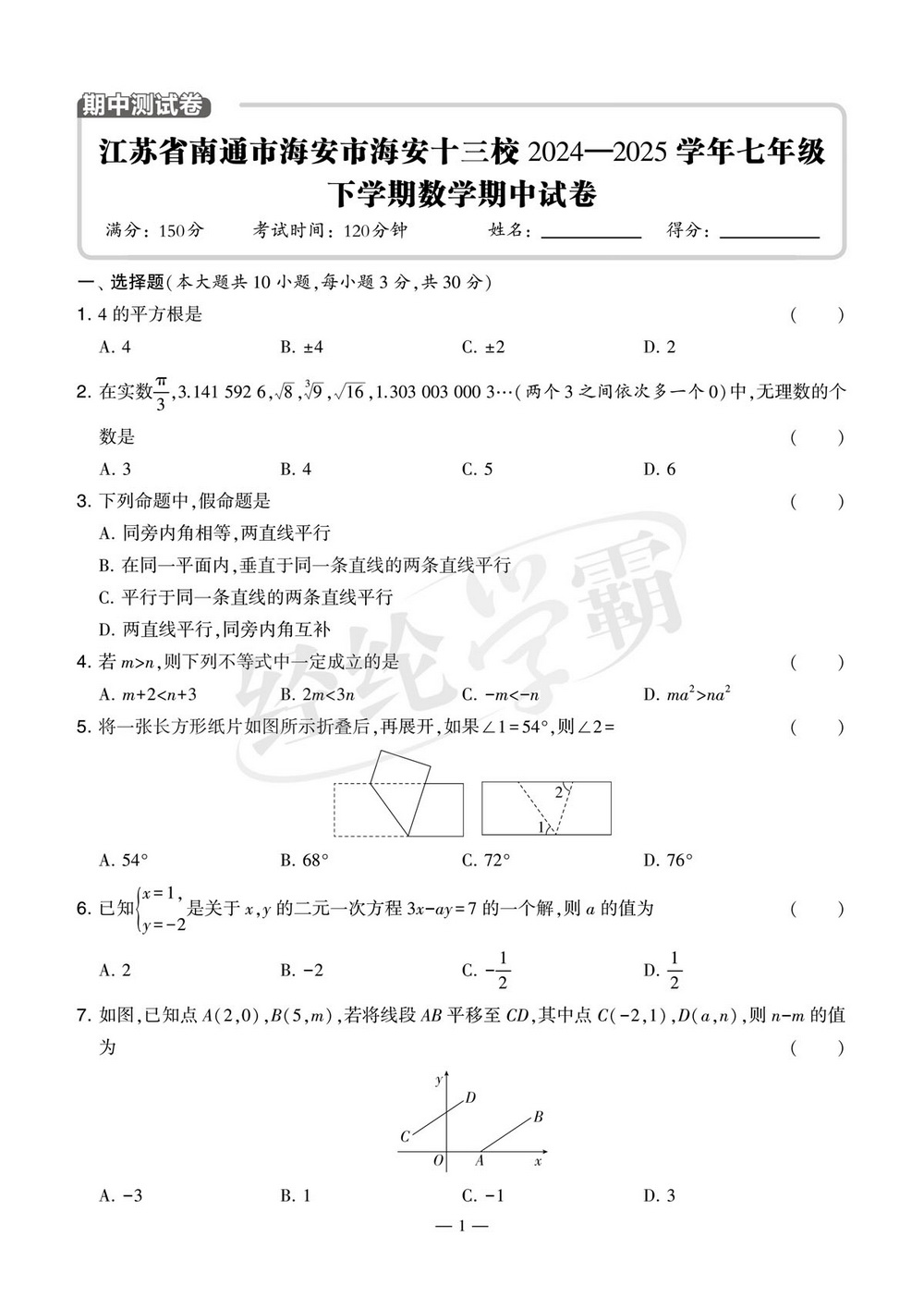 江苏省南通市海安市海安十三校2024-2025学年七年级下学期数学期中试卷