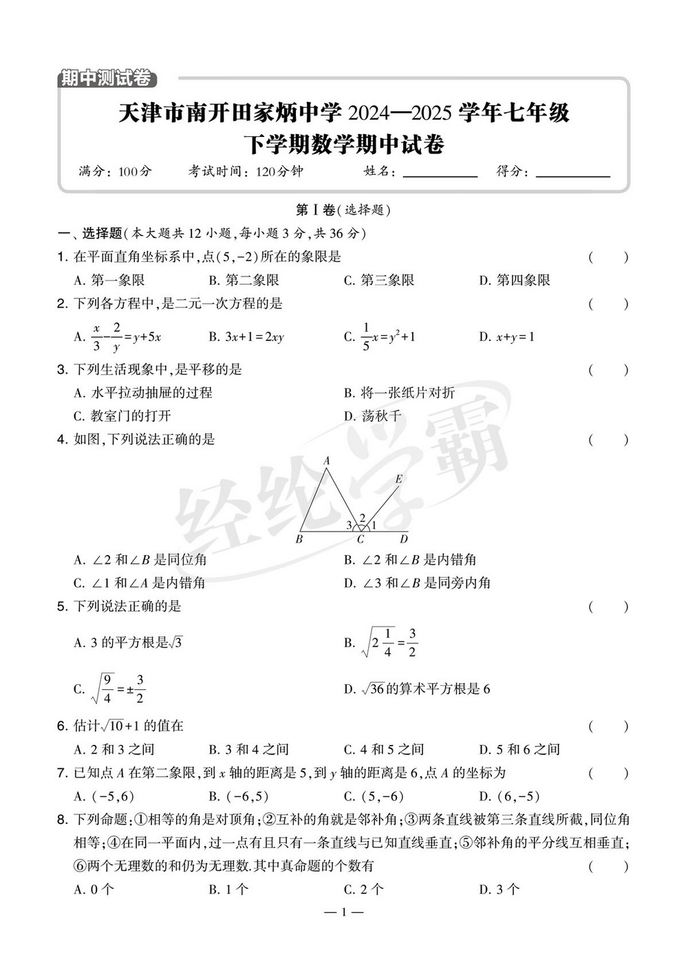 天津市南开田家炳中学2024-2025学年七年级下学期数学期中试卷