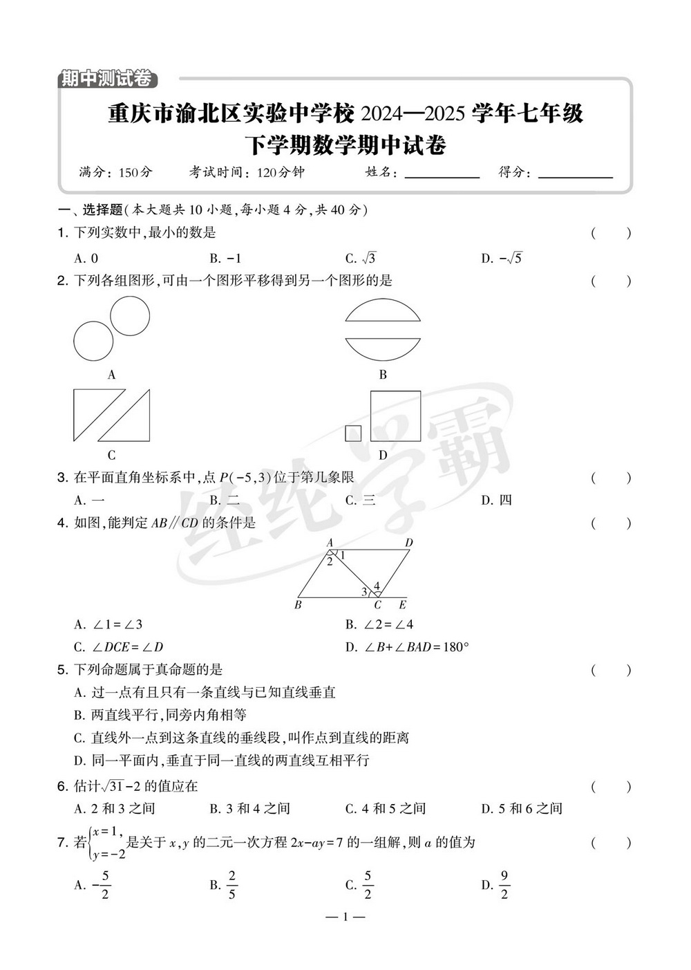 重庆市渝北区实验中学校2024-2025学年七年级下学期数学期中试卷