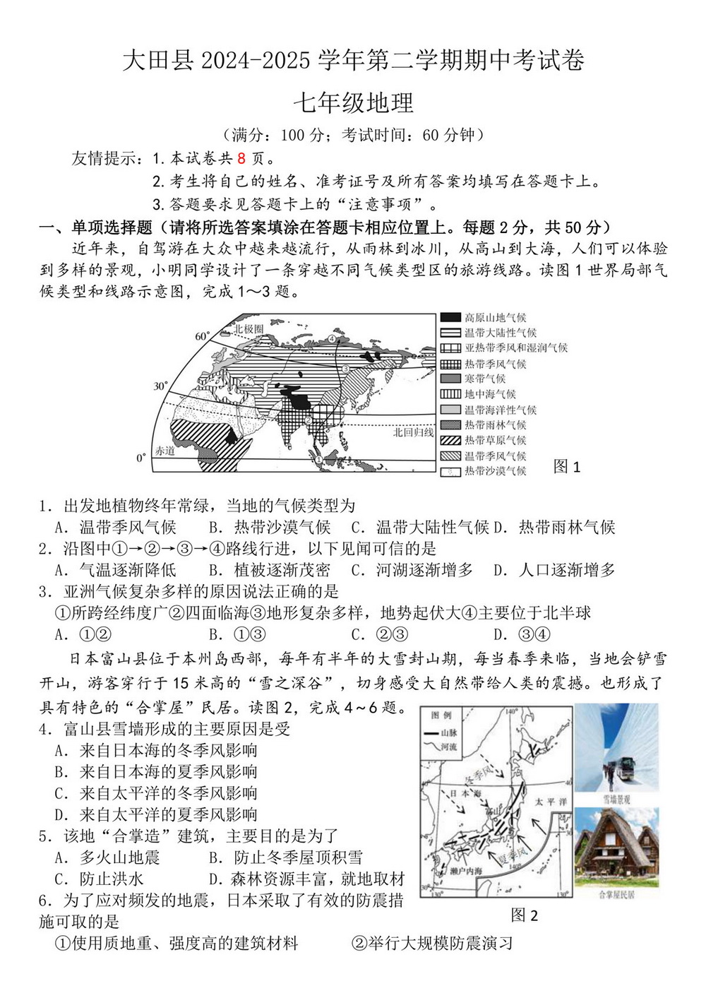 福建省大田县2024-2025学年七年级第二学期地理期中考试卷
