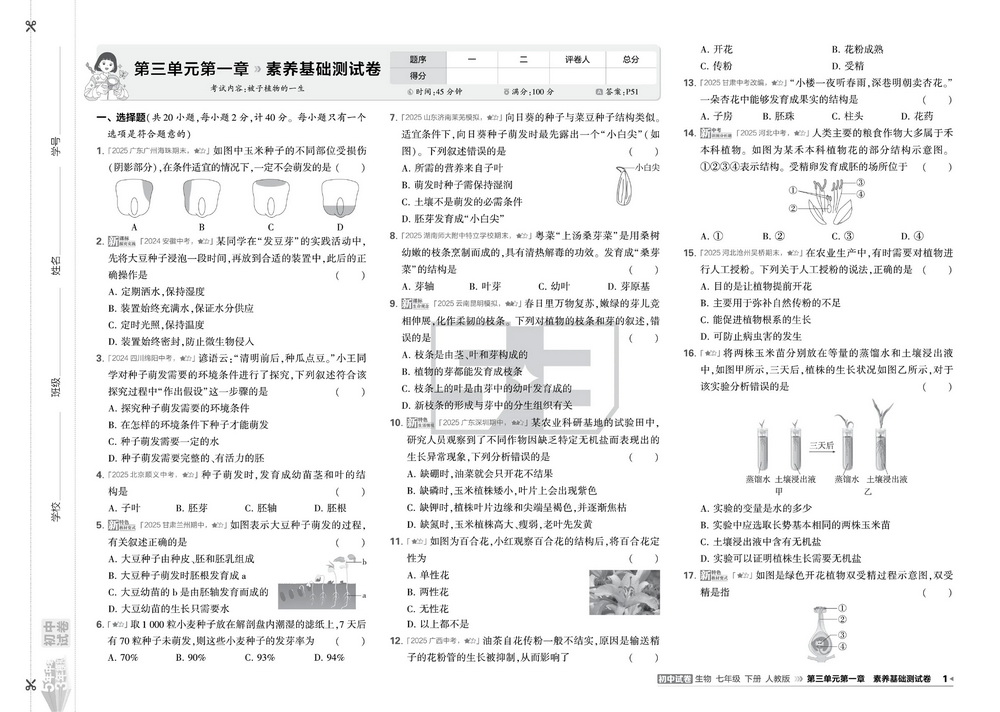 新教材人教版七年级下册生物第三单元第一章测试卷五