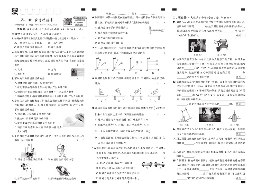 新教材人教版八年级下册物理第七章单元测试卷七