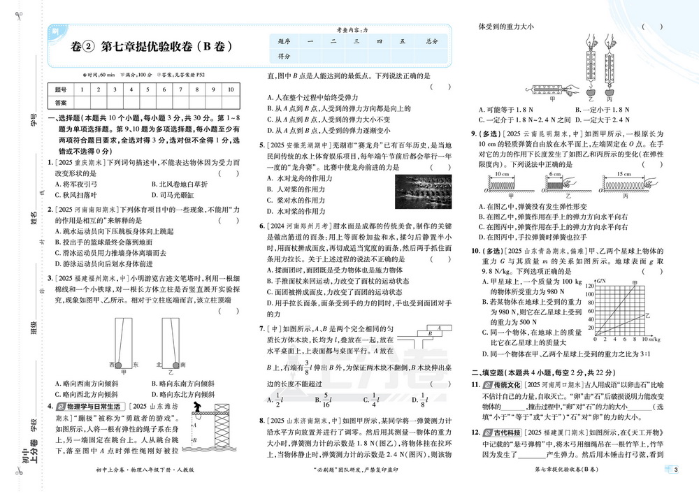 新教材人教版八年级下册物理第七章单元测试卷七