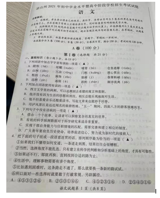 2021年四川省凉山市初中毕业学业水平考试语文试卷