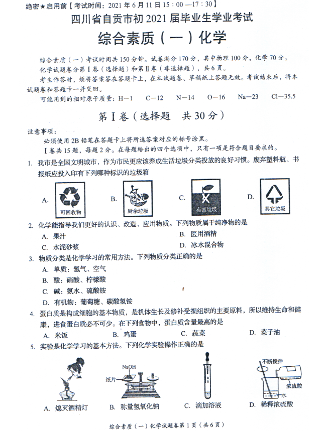 2021年四川自贡初中学业水平考试化学中考真题试卷