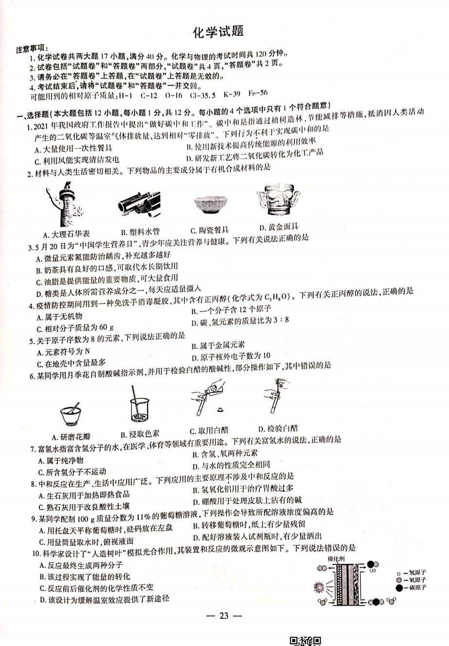 2021年安徽省初中学业水平考试化学中考真题试卷