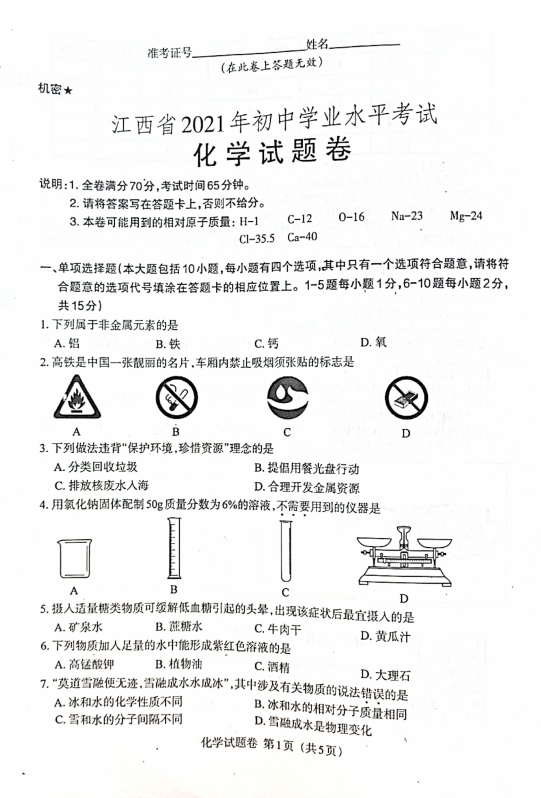 2021年江西省初中学业水平考试化学中考真题试卷