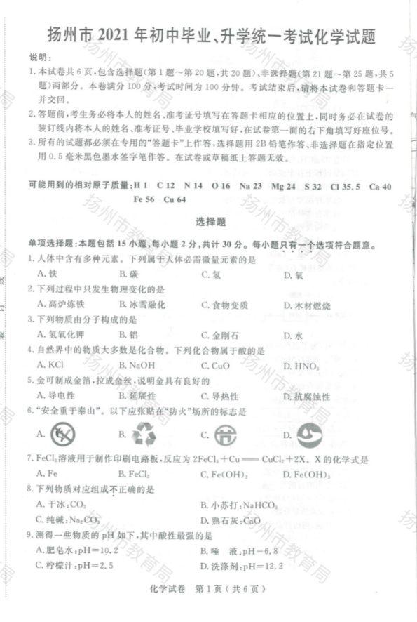 2021年浙江扬州市初中学业水平考试化学中考真题试卷