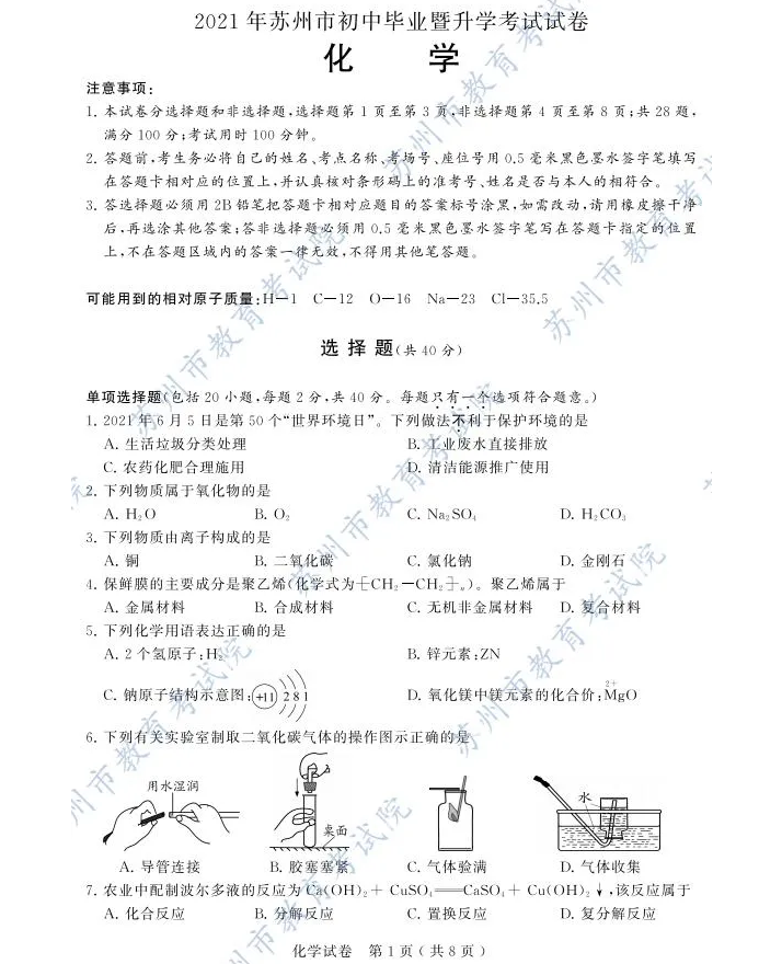 2021年江苏苏州市初中学业水平考试化学中考真题试卷