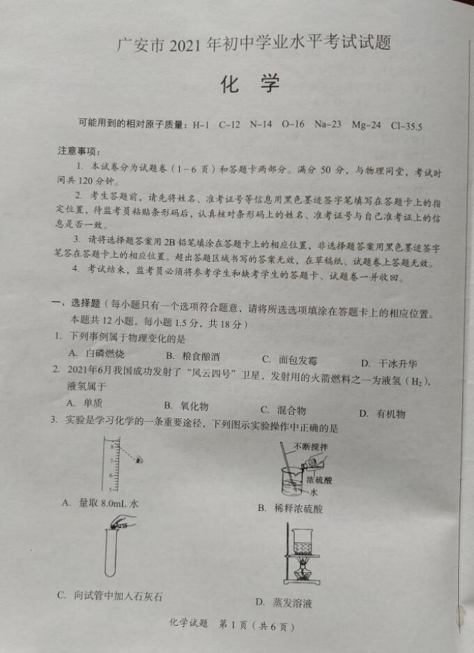 2021年四川广安市初中学业水平考试化学中考真题试卷