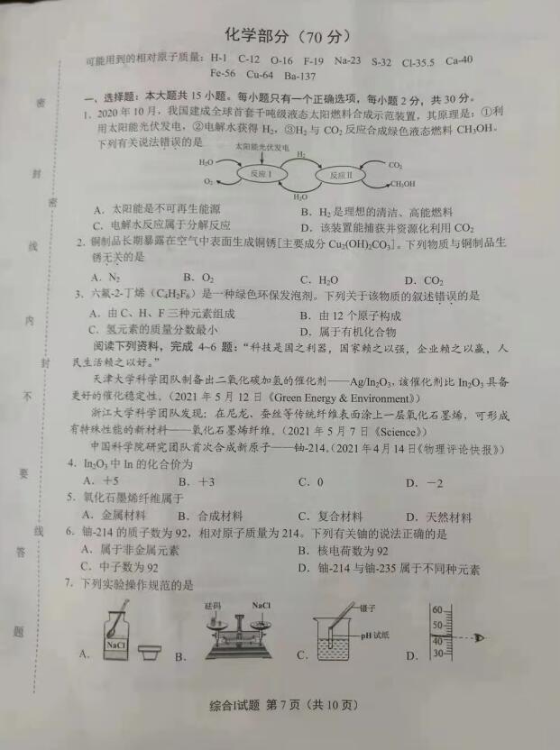 2021年江苏盐城市初中学业水平考试化学中考真题试卷