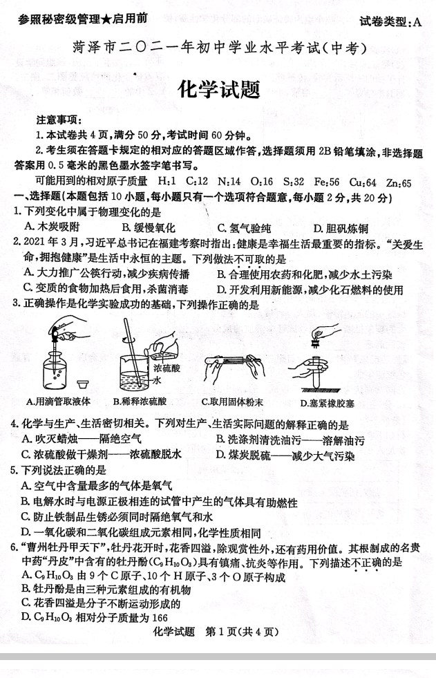2021年山东菏泽初中学业水平考试化学中考真题试卷