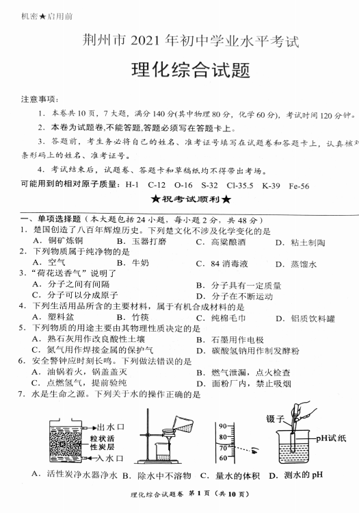 2021年湖北荆州市初中学业水平考试化学中考真题试卷