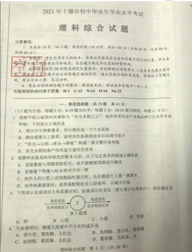 2021年湖北十堰初中学业水平考试化学中考真题试卷