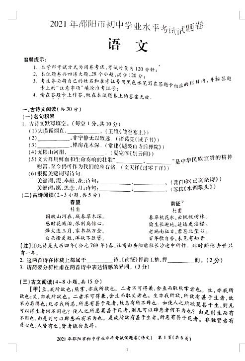 2021年湖南省邵阳市初中毕业学业水平考试语文试卷