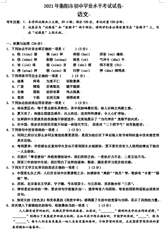 2021年湖南省衡阳市初中毕业学业水平考试语文试卷