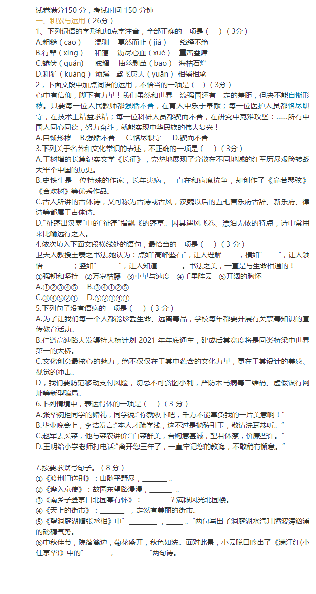 时间:150分钟 / 总分:150分 | 2022-04-15 07:45:09