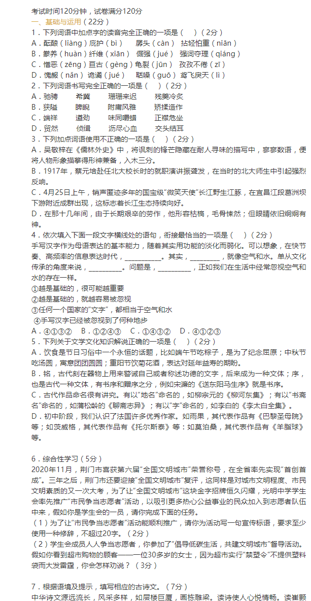 2021年湖北省荆门市初中毕业学业水平考试语文试卷