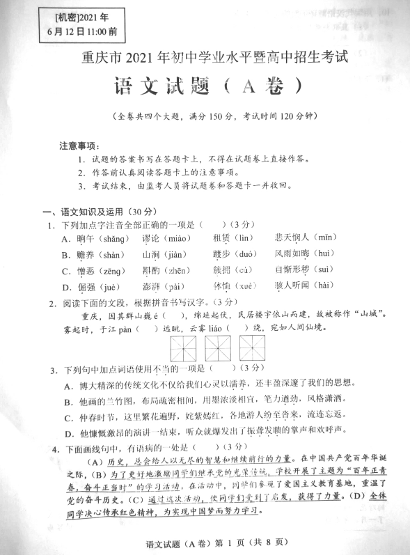 上一篇:2021年四川自贡初中学业水平考试语文试卷