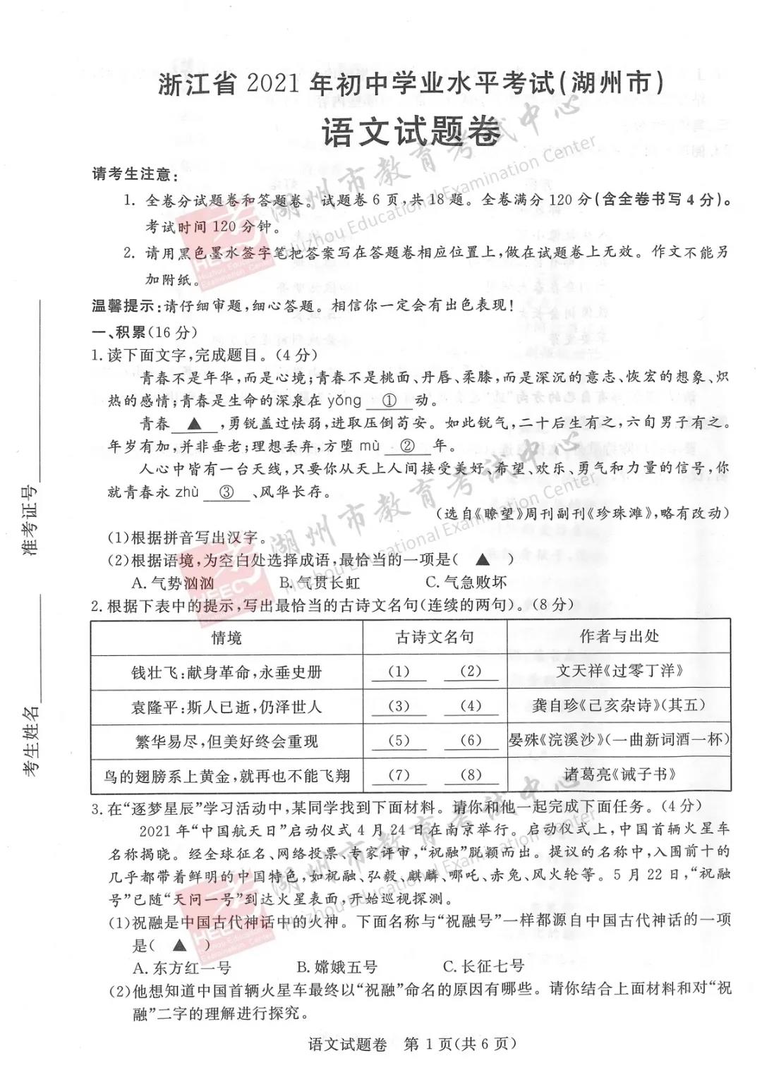 2021年浙江省湖州市初中学业水平考试语文试卷