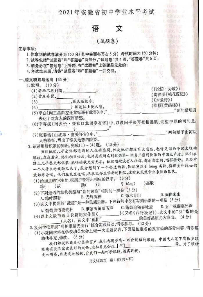 2022年贵州安顺初中毕业学业水平考试语文试卷