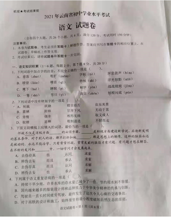 2021年云南省初中学业水平考试语文试卷
