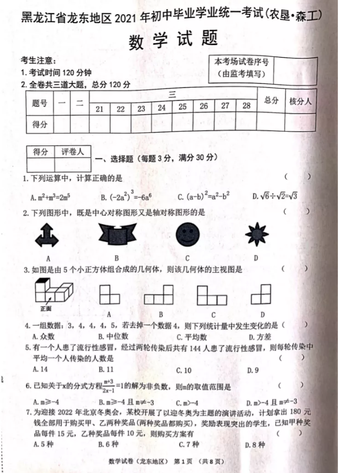 2021年黑龙江龙东地区初中学业水平考试数学试卷
