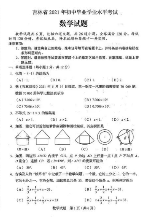 2021年吉林省初中学业水平考试数学试卷