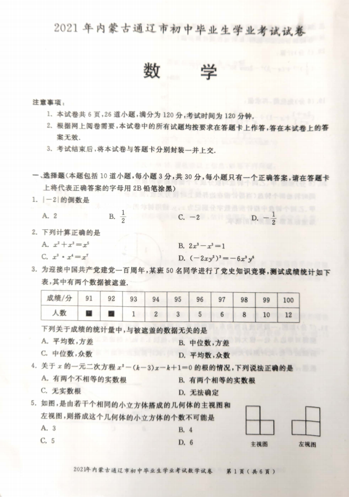 2021年内蒙古通辽初中学业水平考试数学试卷